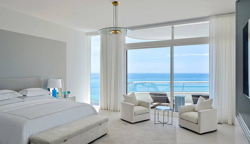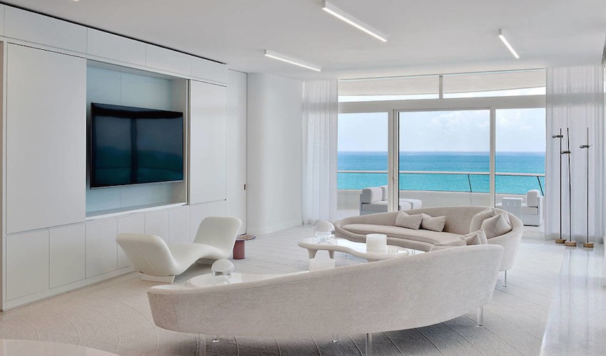 Phòng khách được sử dụng tông màu trắng sáng tinh khôi, từ đây nhìn ra biển xanh nổi bật mênh mông, càng tôn thêm vẻ đẹp của phòng khách sang trọng.