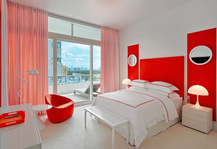 Một phòng ngủ được phối màu đỏ tinh tế với rèm cửa, ghế ngồi và bức tường đầu giường cũng sơn đỏ đồng bộ. Chăn gối điểm chút họa tiết đỏ trên nền trắng cùng tường trắng làm nổi bật không gian phòng ngủ đặc trưng.