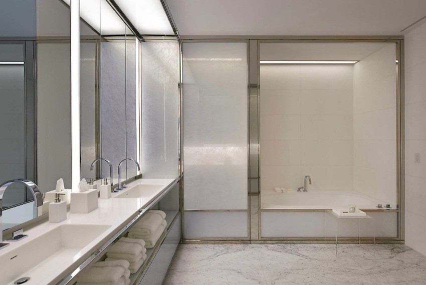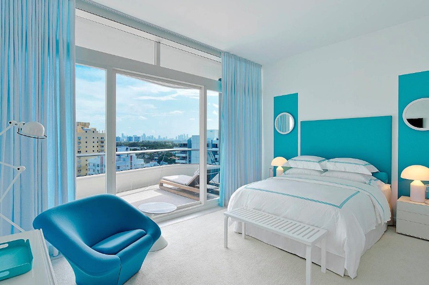 Ở một phòng ngủ khác lại được điểm tô sắc xanh dịu dàng, đồng điệu màu trời xanh, xa xa là những tòa nhà trong thành phố. Hoàn toàn giống phòng ngủ bên trên từ kiểu dáng đến đồ dùng, chỉ là cách phối màu khác giúp phóng ngủ nổi bần bật, ai cũng phải xuýt xoa vì sự tinh tế này.