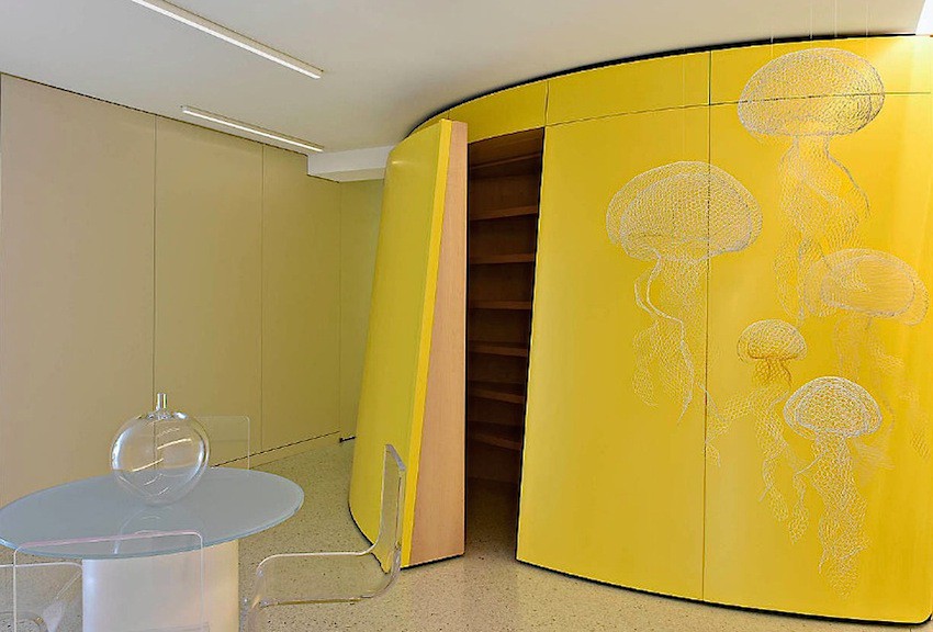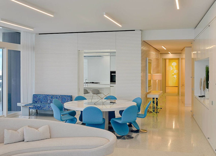 Hãy thử tưởng tượng bạn sống trong một căn hộ có thể ra khỏi giường mỗi ngày và mở mắt nhìn ra biển xanh, cảm giác như thế nào? Nhà thiết kế sử dụng các khối trắng đơn giản màu trắng và xanh biển để tạo ra một không gian chung, và được chia thành các phòng bằng màu sắc khác nhau.