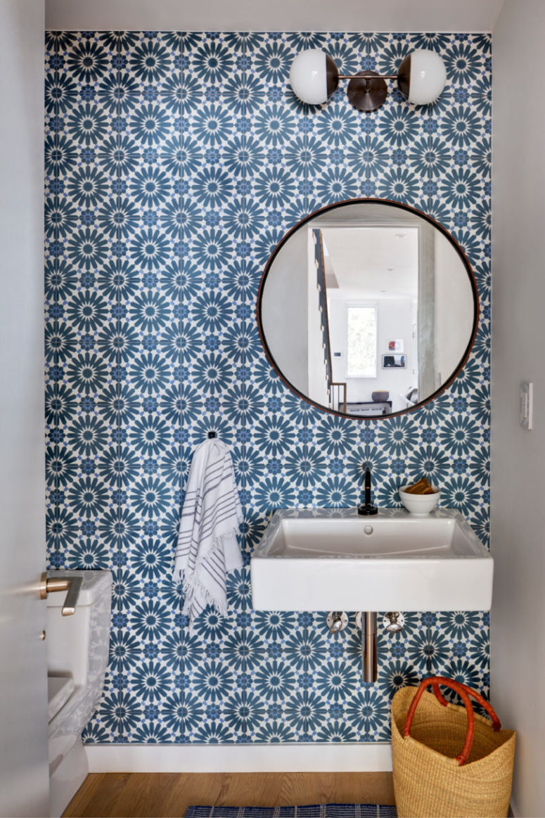 Bức tường gạch với màu xanh in hoa thật tuyệt vời kết hợp với gương tròn để giúp không gian rộng hơn.
