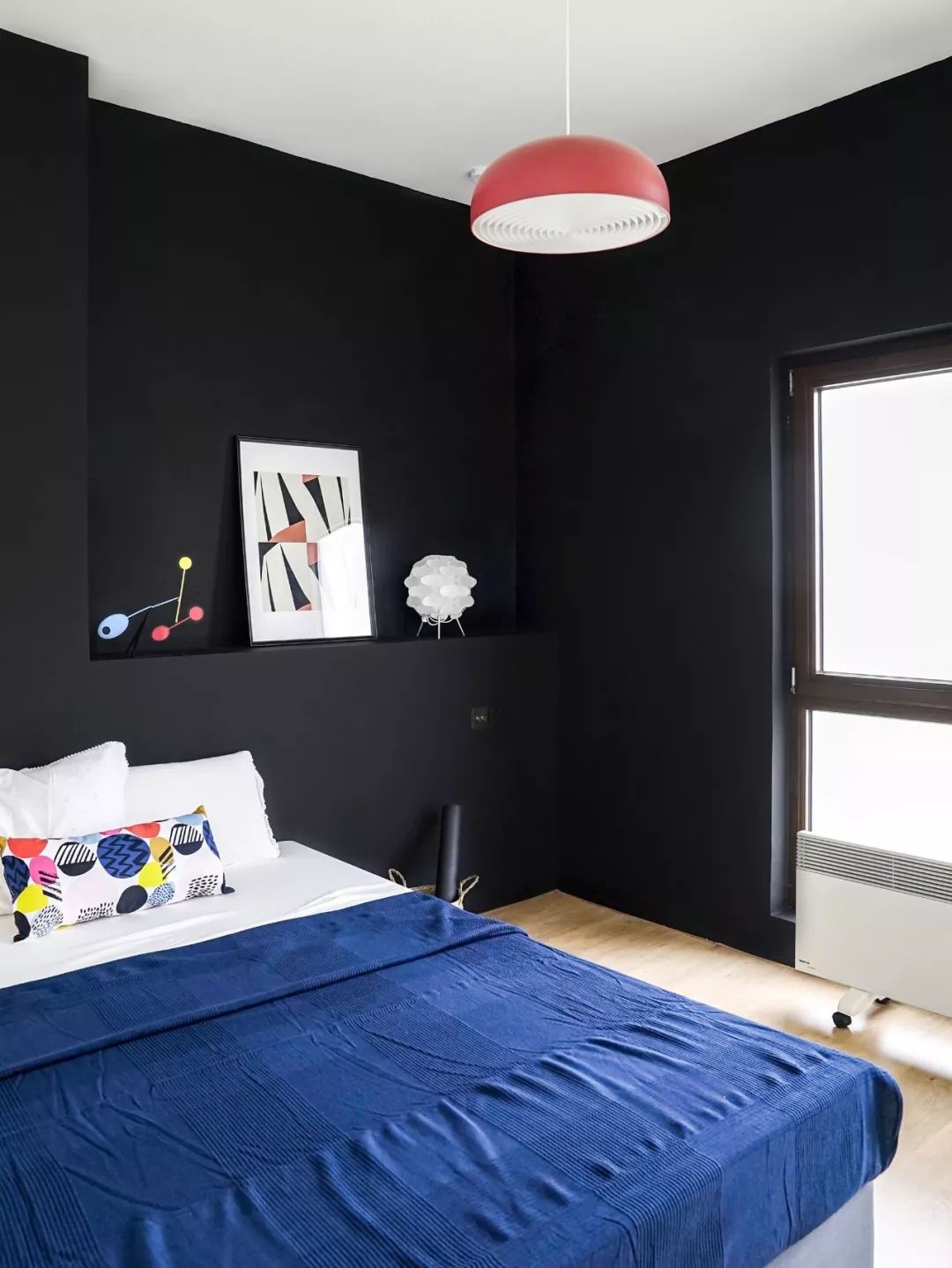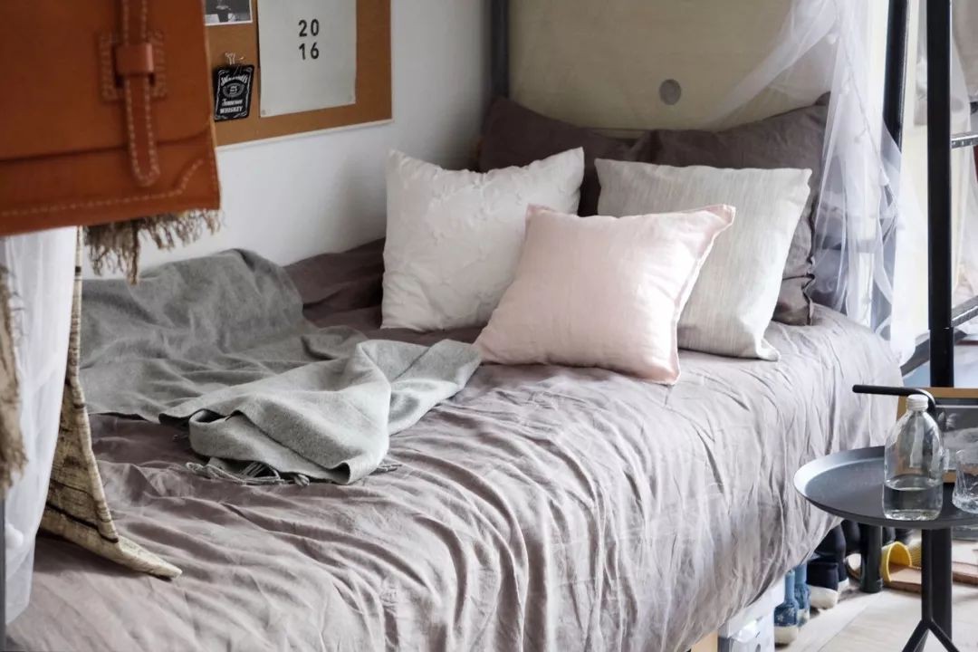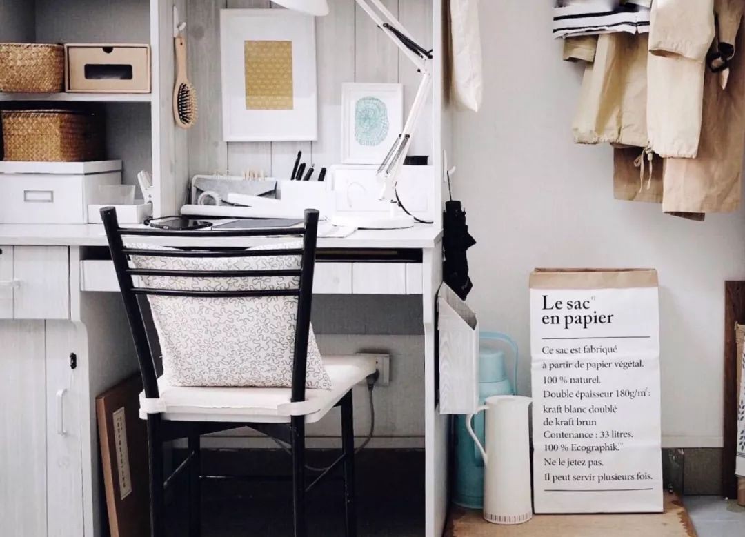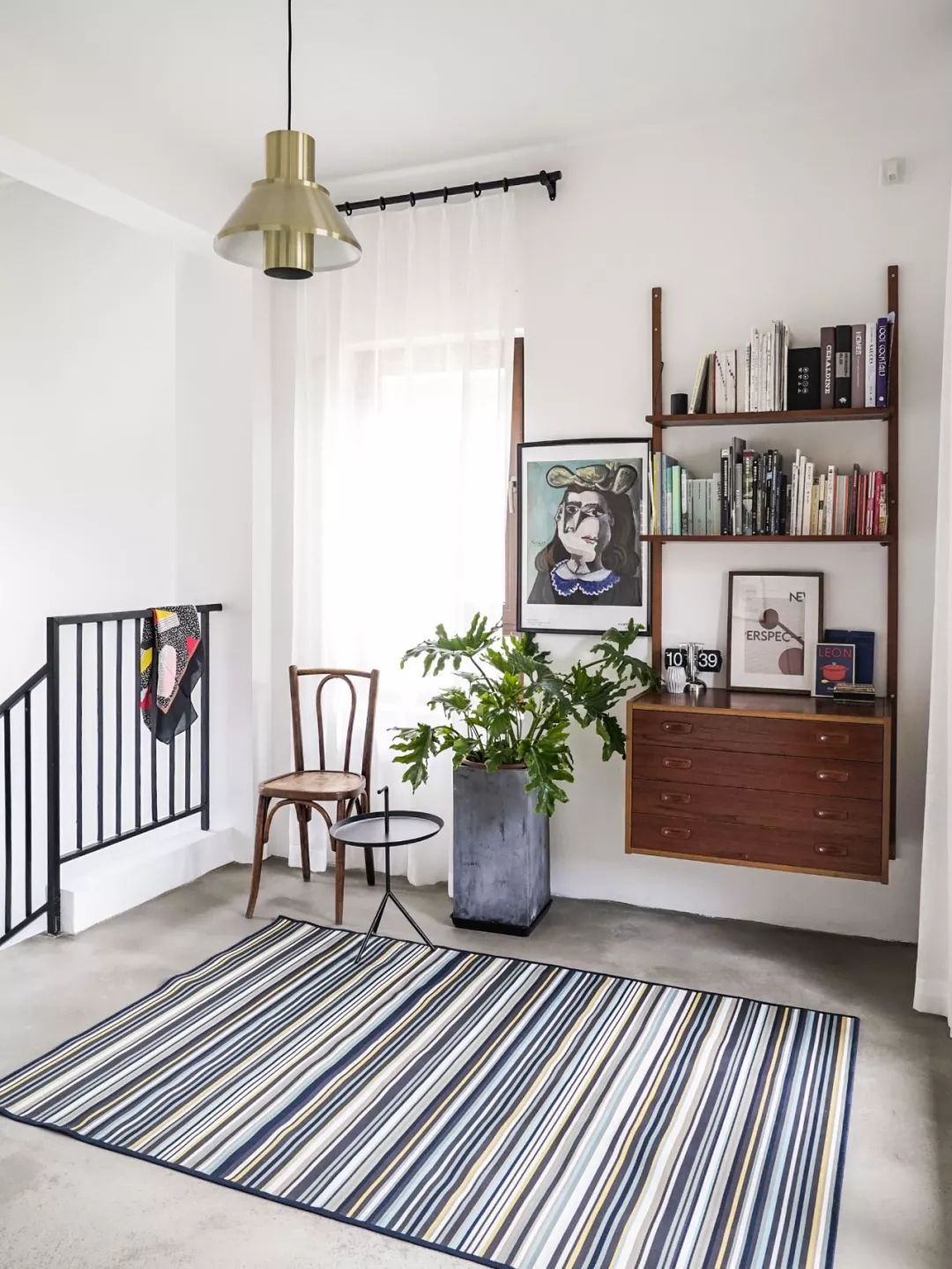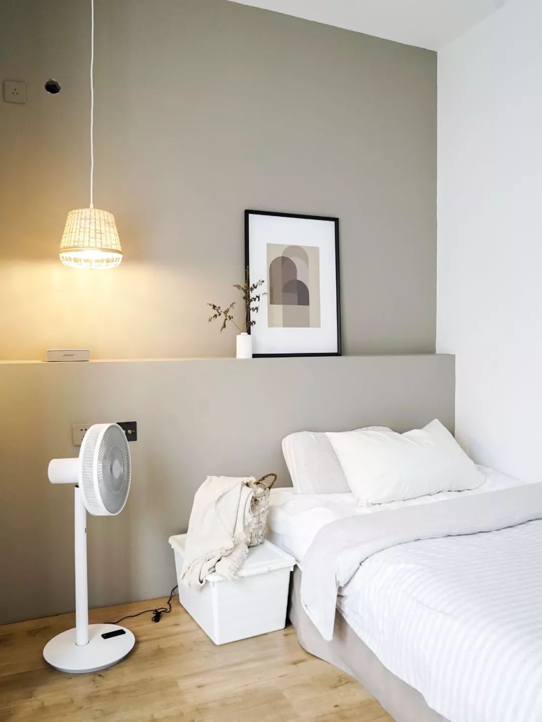 Tầng hai là phòng ngủ với một ngăn kéo đựng đồ cũ theo phong cách trung cổ. Một tủ quần áo chứa hầu hết trang phục được sắp xếp theo màu sắc. Màu nên của căn phòng trở nên yên tĩnh và mang đến cảm giác êm dịu nhờ pha trộn giữa hai gam màu, trắng và cà phê sữa.