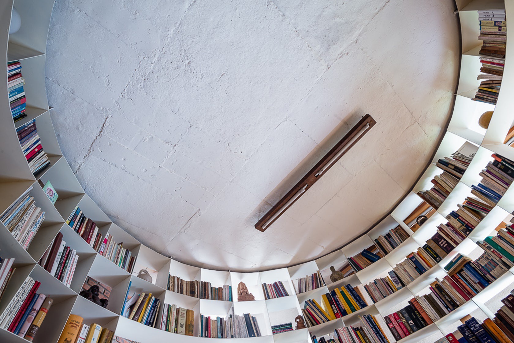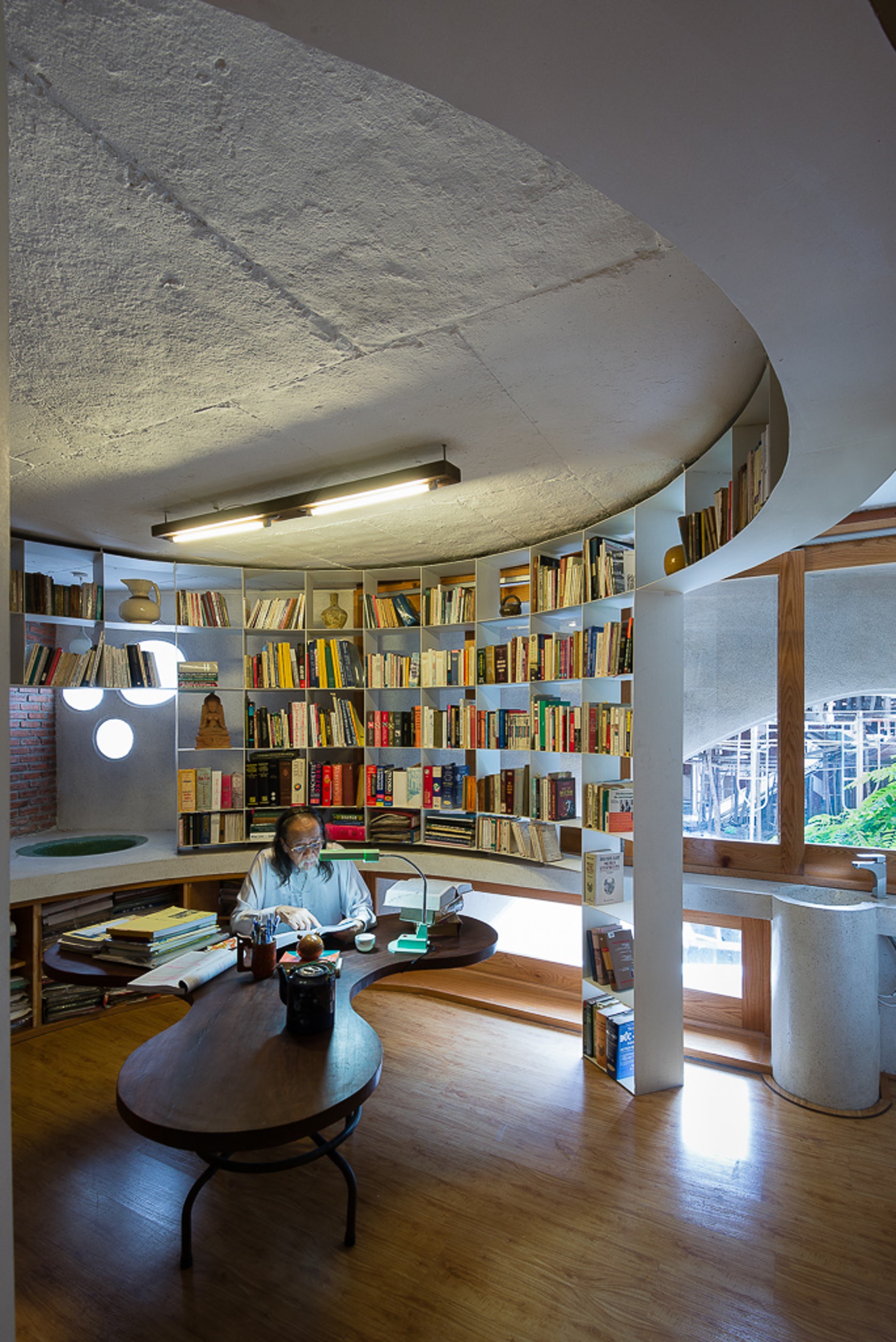Tầng 2 vốn là không gian sinh hoạt chính của Giáo sư T. là khu vực có thiết kế vô cùng độc đáo. Điểm nhấn của tầng này nằm ở phòng làm việc hình tròn với bức tường bao được biến thành giá sách lớn, đủ không gian lưu trữ sách vở của con người vốn dành cả đời để nghiên cứu.