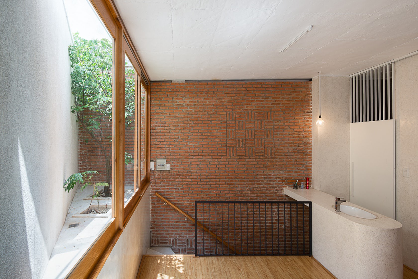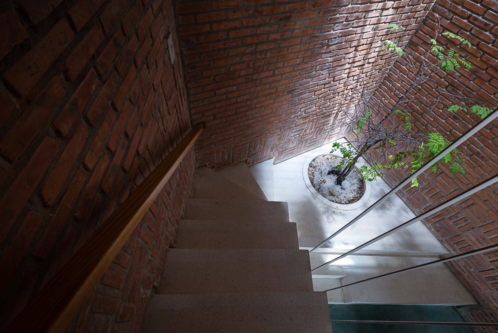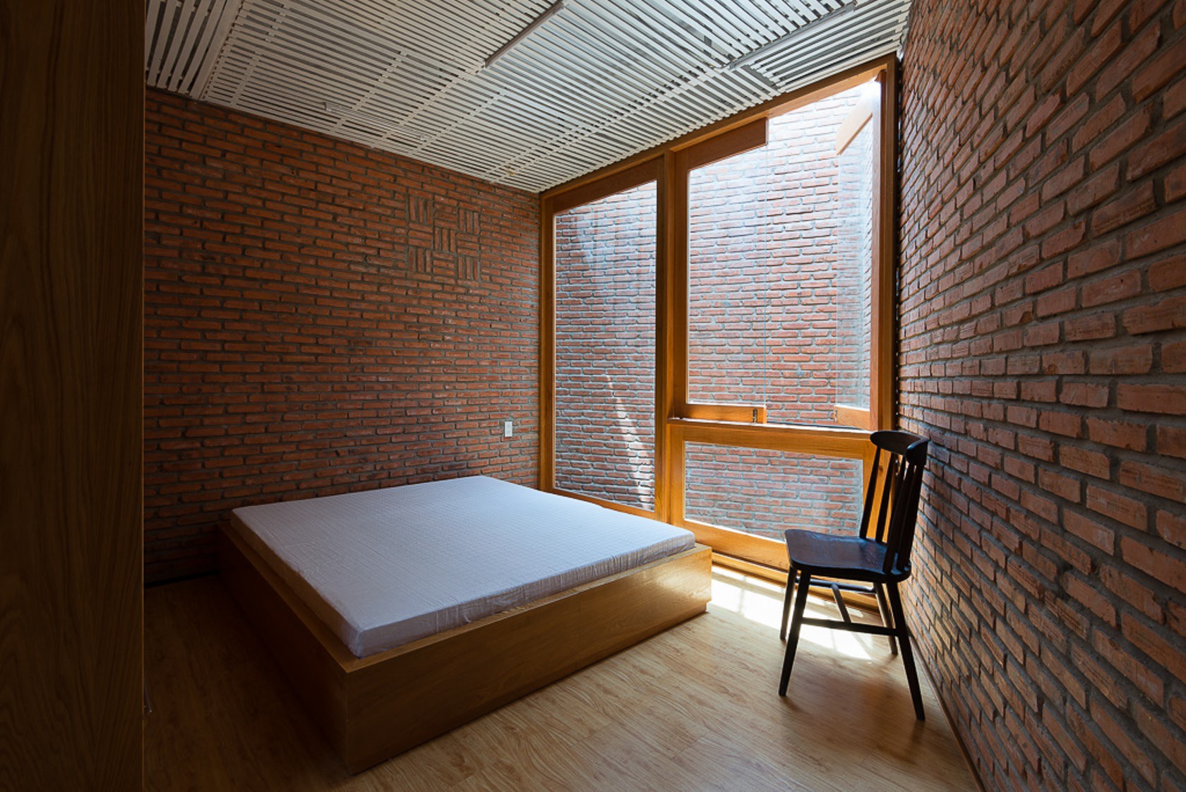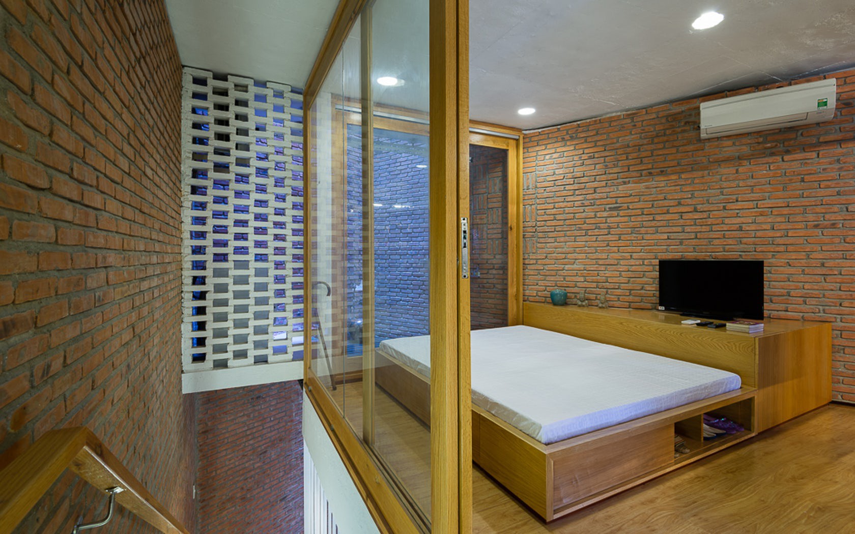Ở lớp tường sát với không gian đệm, KTS sử dụng gạch nung xếp chồng để gia tăng khả năng thông gió và làm mát toàn bộ ngôi nhà. Phần trần nhà ở các tầng trên và phòng ngủ cũng được tạo một lớp đệm bằng nan gỗ nhằm giảm nhiệt độ tác động từ trần xuống không gian phía dưới.