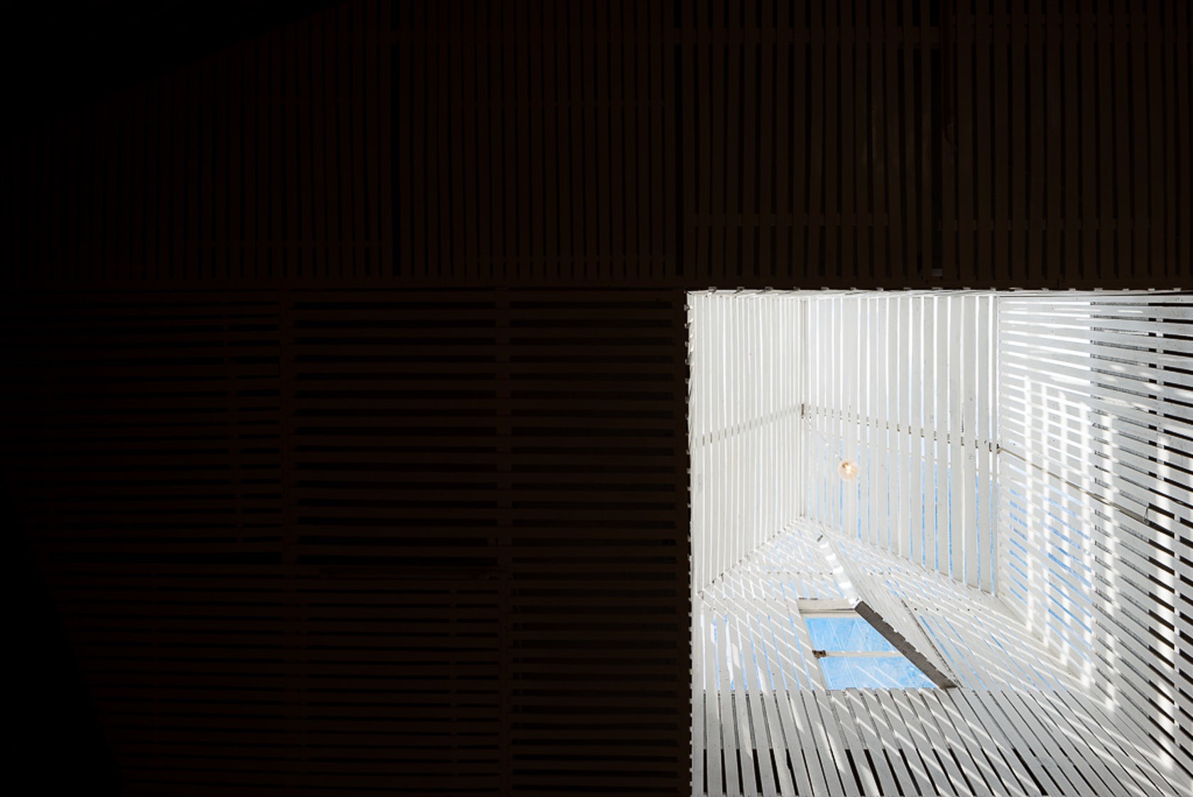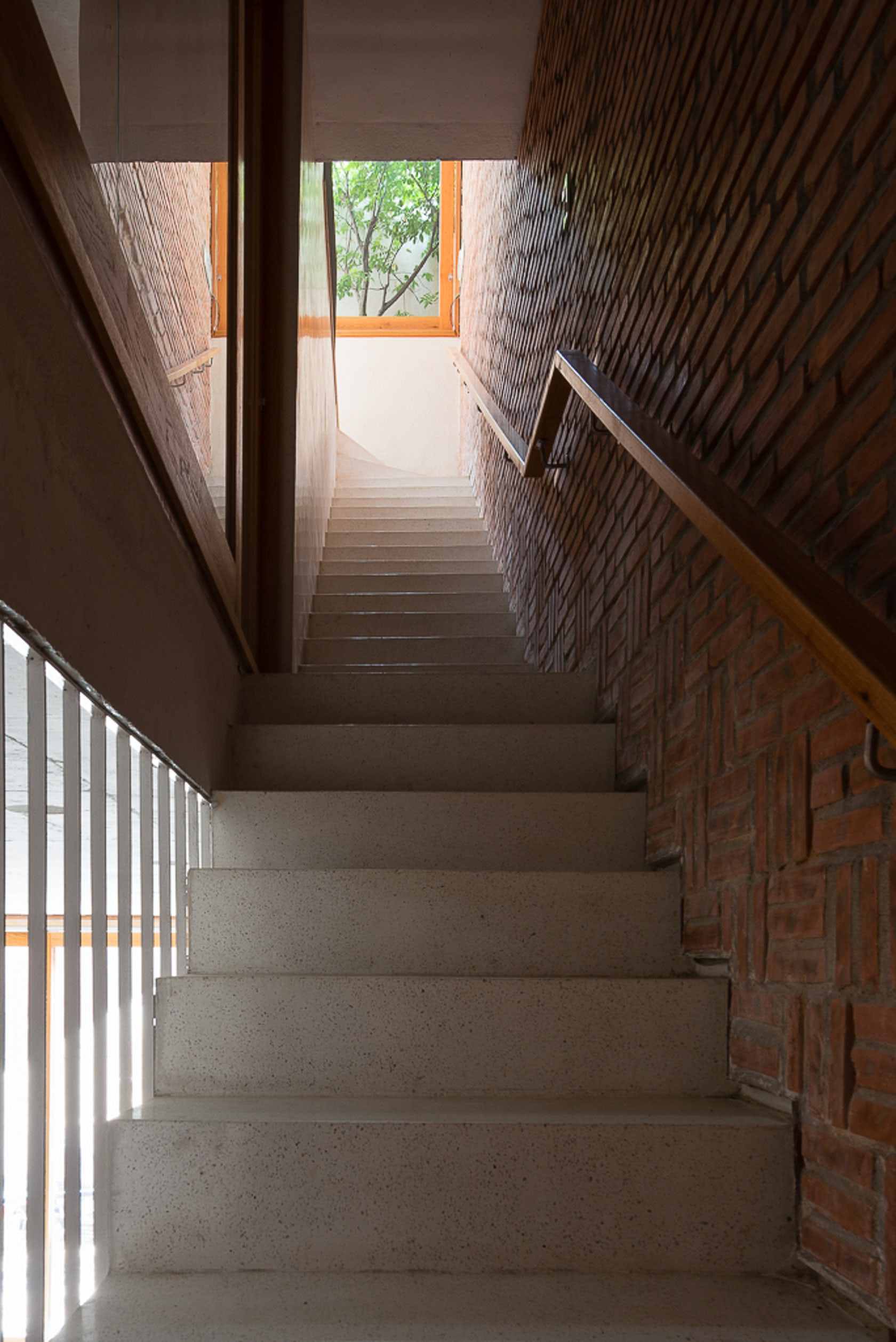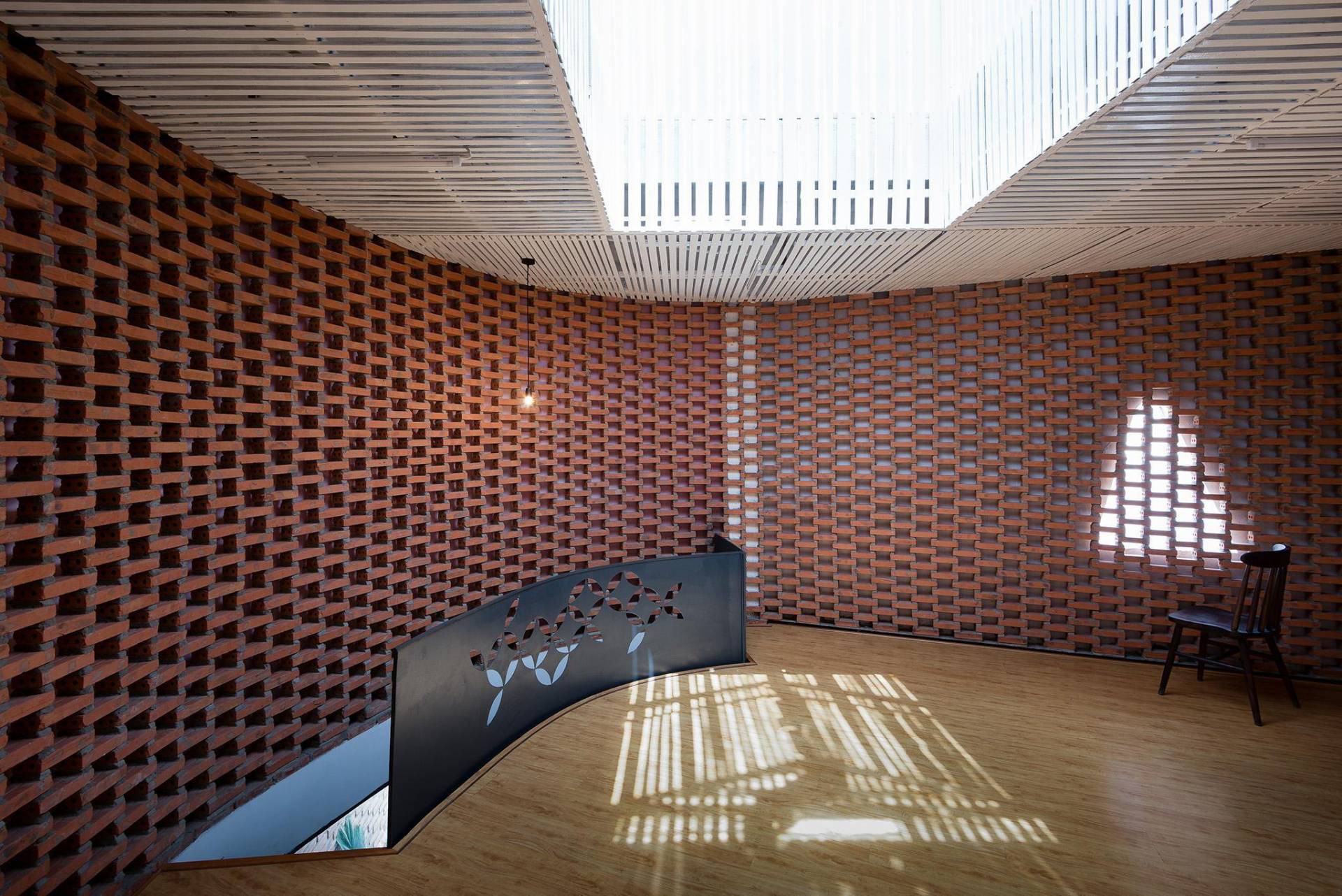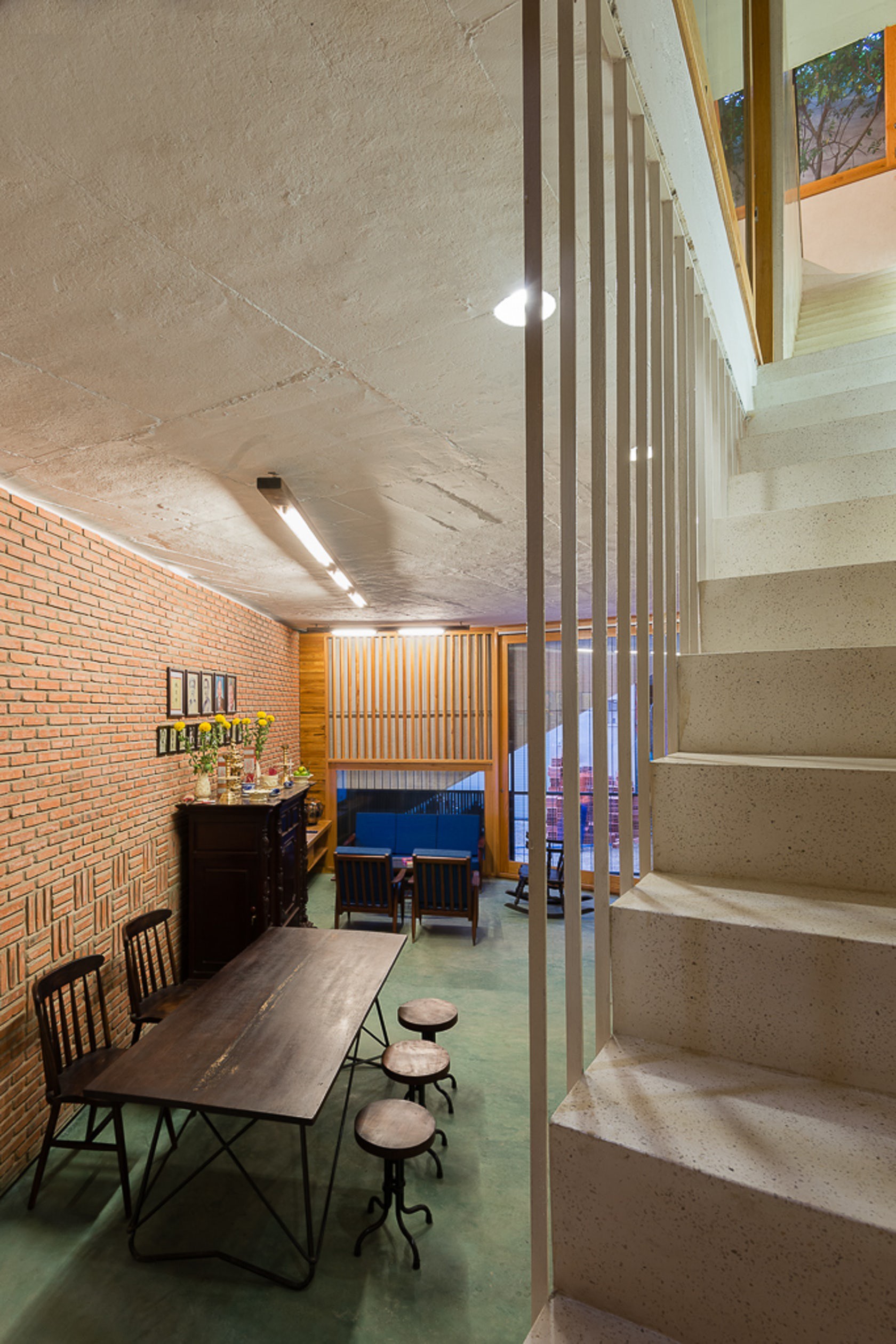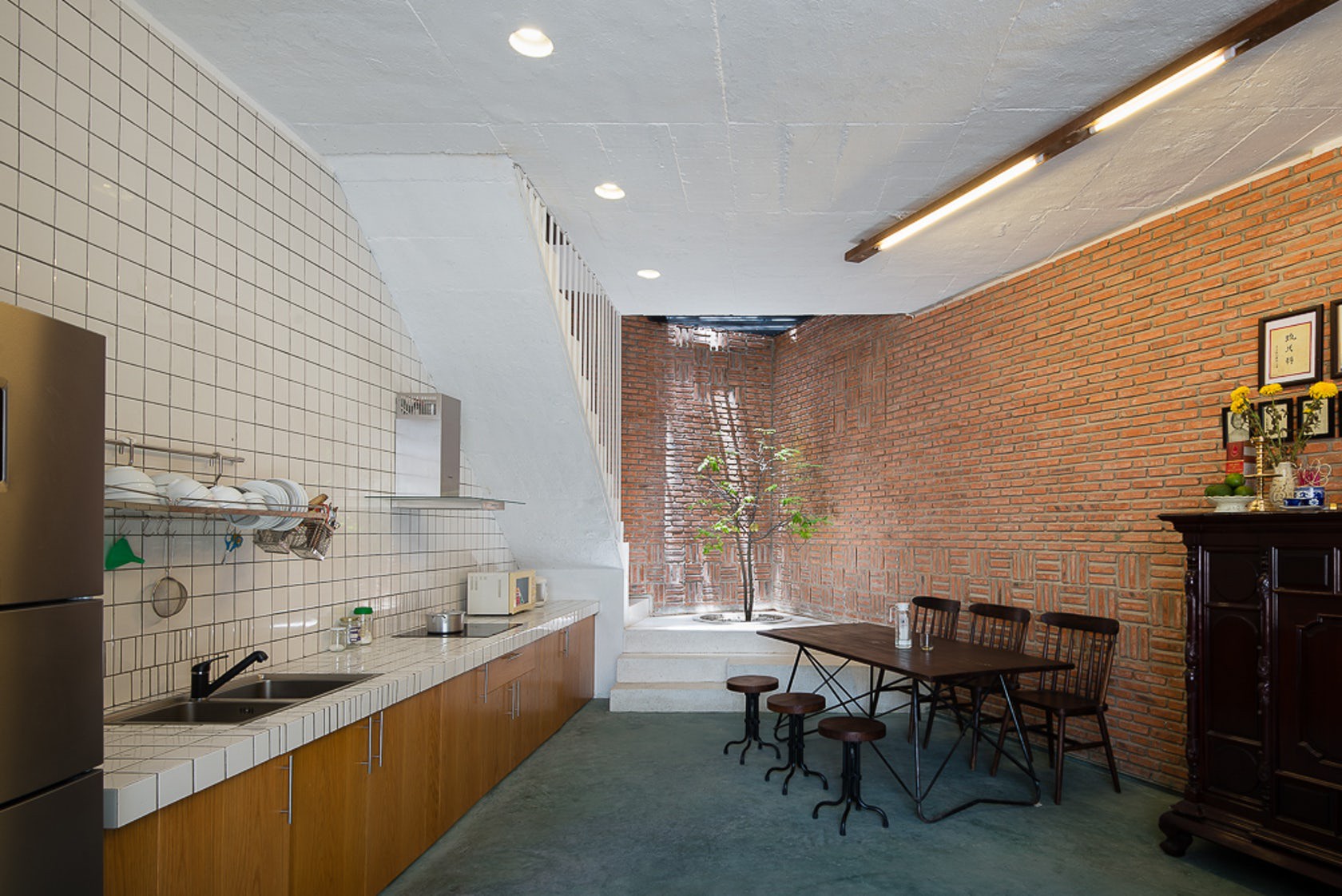 Ở lớp tường sát với không gian đệm, KTS sử dụng gạch nung xếp chồng để gia tăng khả năng thông gió và làm mát toàn bộ ngôi nhà. Phần trần nhà ở các tầng trên và phòng ngủ cũng được tạo một lớp đệm bằng nan gỗ nhằm giảm nhiệt độ tác động từ trần xuống không gian phía dưới.