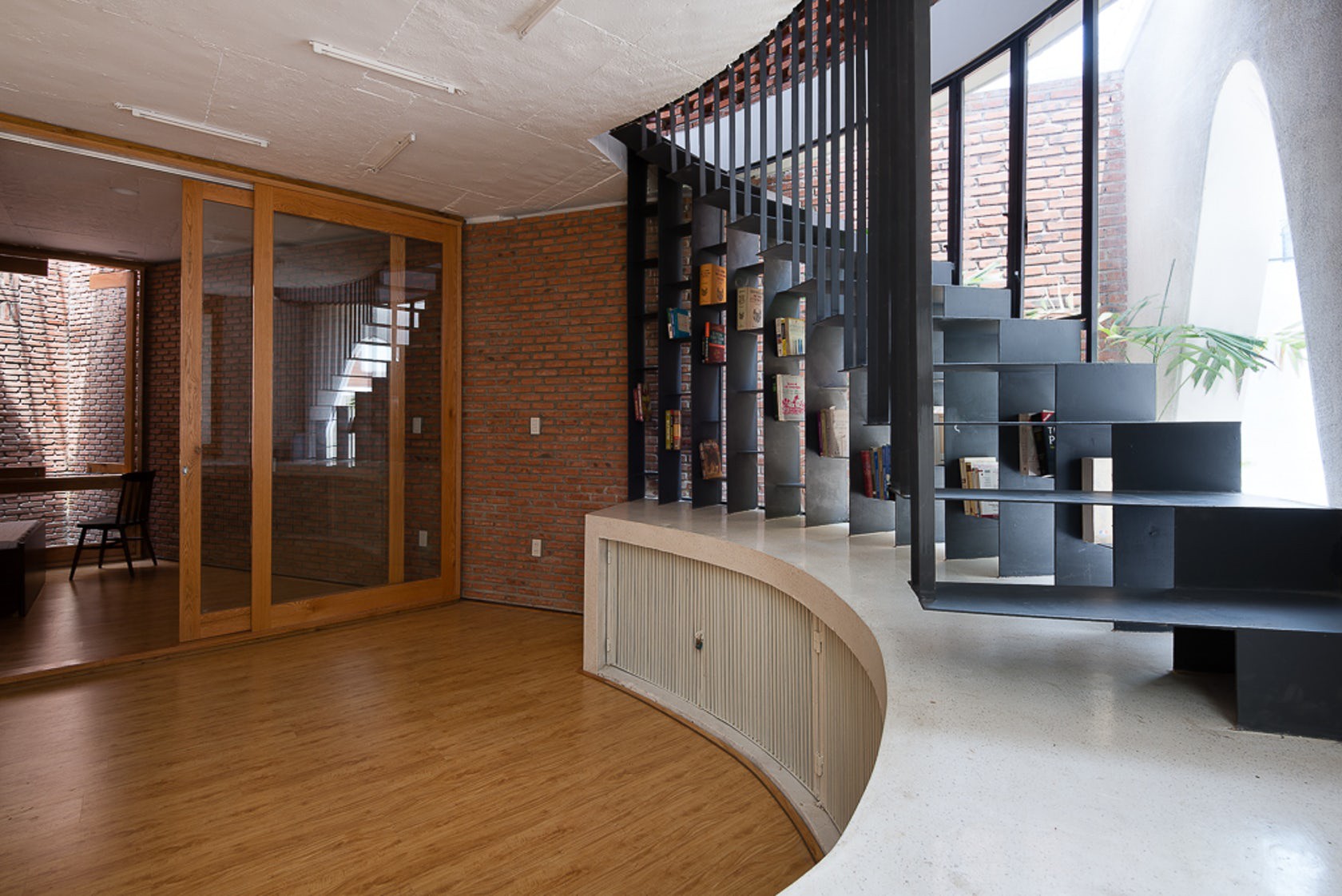 Nhờ có lớp tường kính và khoảng đệm chừa lại khi thiết kế mà các phòng luôn ngập tràn ánh sáng và cũng như không bị cảm giác quá nóng bức. Song song với đó, những hệ cầu thang dẫn từ tầng 2 lên trên còn được tận dụng để trở thành một giá sách phụ kiêm đồ trang trí, và thậm chí là góc nghỉ cho các thành viên trong nhà.