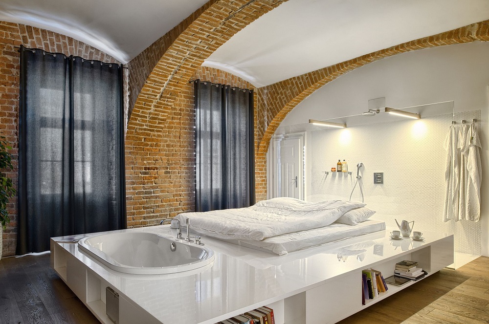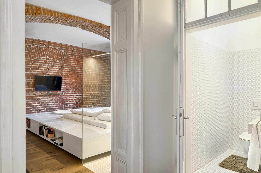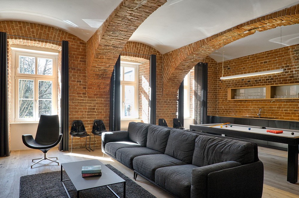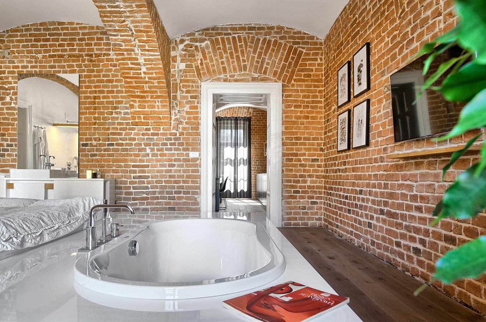 Không gian rộng lớn, sáng sủa cùng với việc sử dụng tiết kiệm những nội thất đã khiến cho những bức tường được làm từ gạch cổ điển này thêm phần nổi bật, bắt mắt.