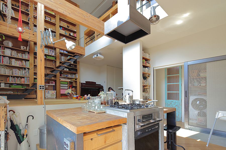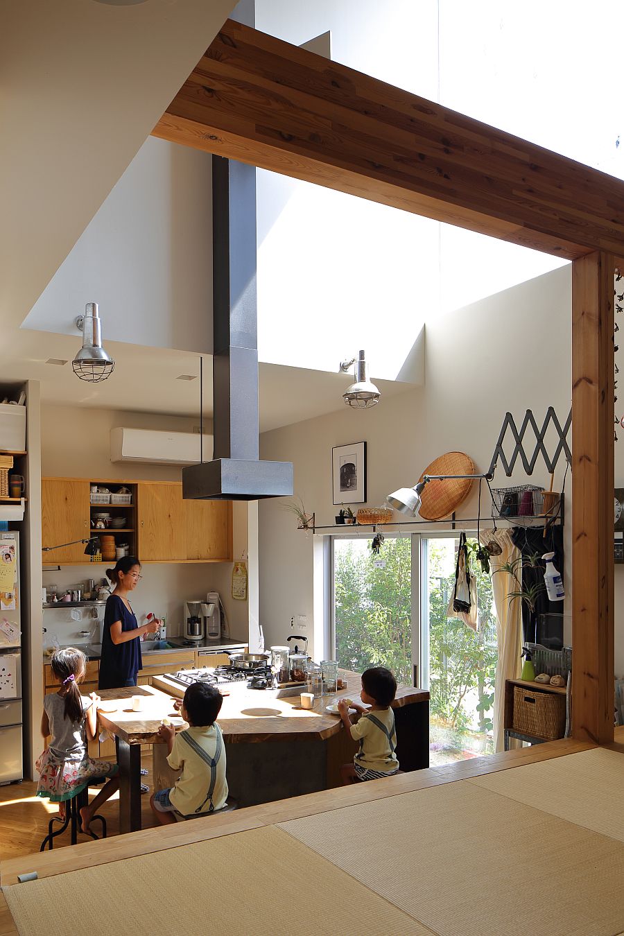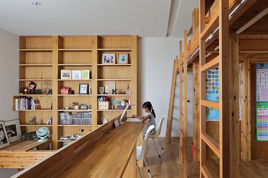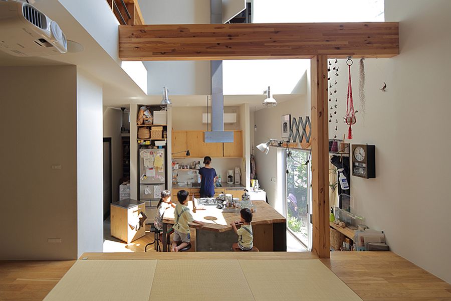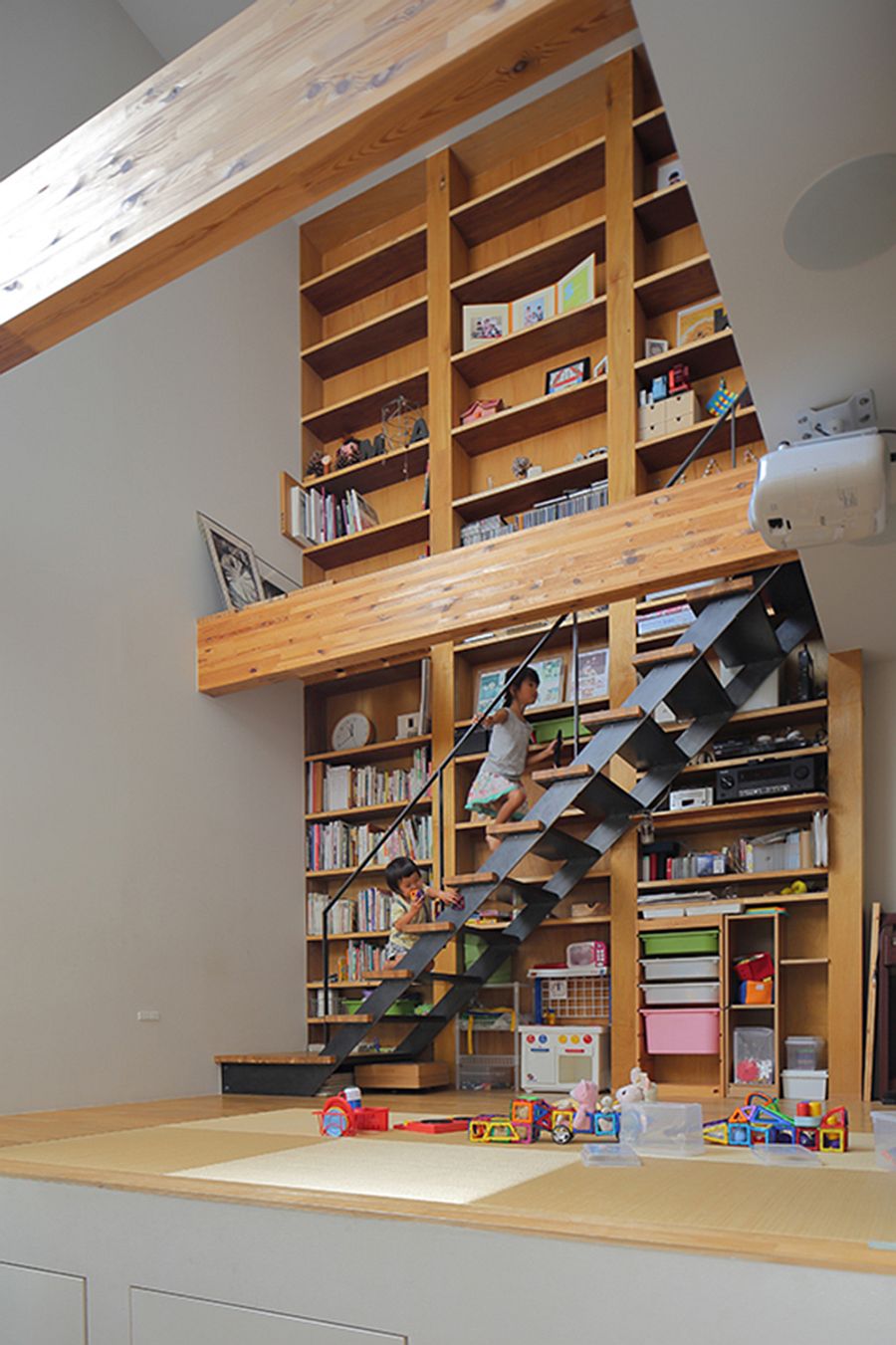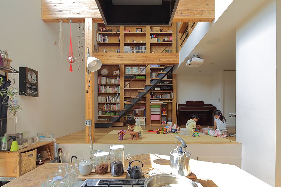 Từ cửa chính bước vào là không gian vui chơi, sinh hoạt chung của mọi người trong gia đình mà ở đây, là ưu tiên cho trẻ nhỏ. Toàn bộ bức tường sát lối cầu thang lên gác xép được sử dụng triệt để cho chức năng bố trí đồ đạc, sách vở, đồ dùng cần thiết. Sàn gỗ được tiếp nối tạo mặt phẳng cho không gian nhỏ, thêm chiếc chiếu tatami để bọn trẻ thoải mái vừa chơi vừa ngồi đọc sách, thậm chí là ngủ ngay trên sàn.