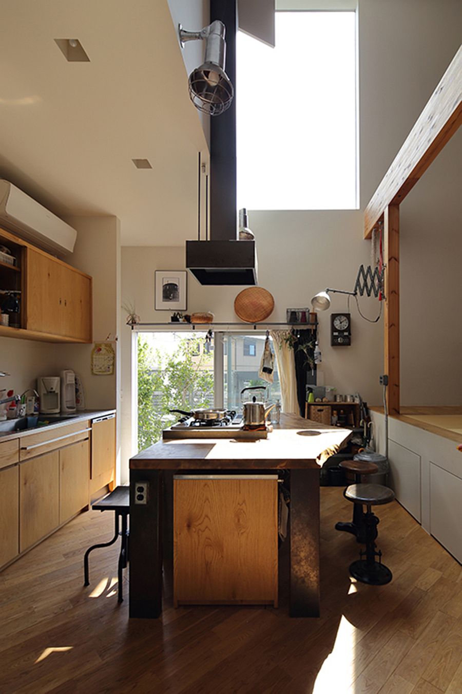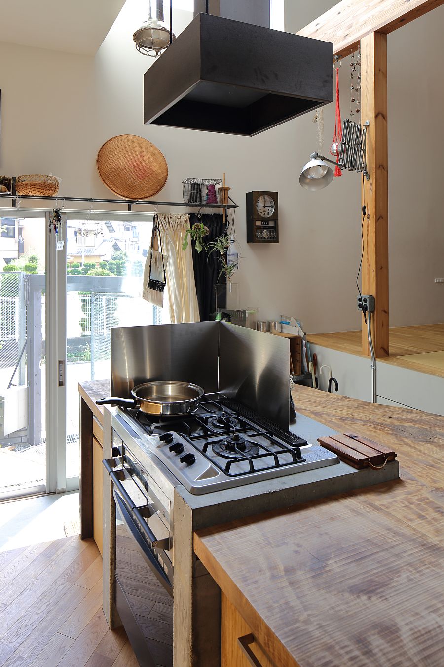 Ánh sáng được tận dụng tối đa không chỉ từ những ô cửa kính mà còn từ giếng trời phía trên mái của ngôi nhà. Bếp ăn thực chất không rộng lắm nhưng với cách bố trí gọn gàng, khoa học đã tạo nên sự tiện dụng và thoải mái cho mọi người. Đặc biệt, phần giật cấp của không gian chính với bếp tạo ra khoảng trống phía dưới sàn, tạo nên sự tiện lợi cho việc bố trí lưu trữ đồ dùng.