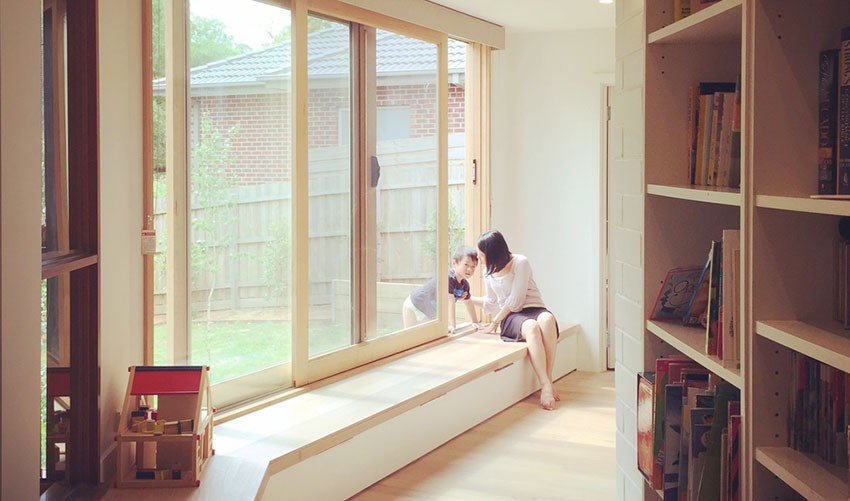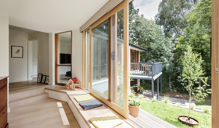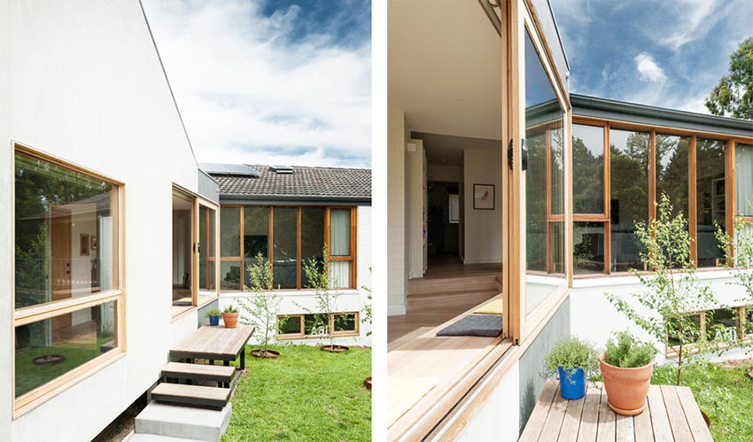 Căn nhà có mọi góc nhỏ ngập tràn ánh sáng tự nhiên, gần gũi với thiên nhiên xung quanh nhờ hệ thống kính trượt và hành lang thông các phòng một cách khéo léo.