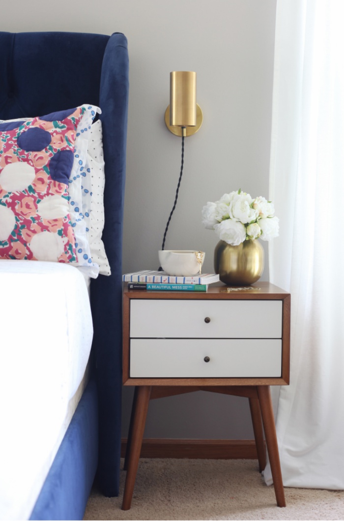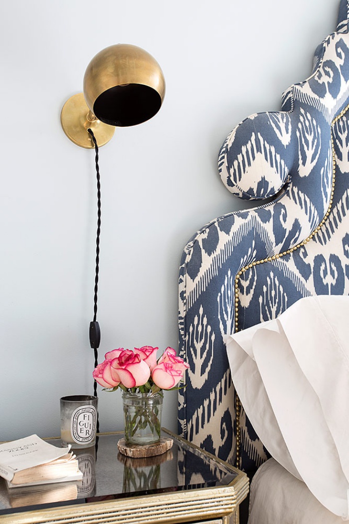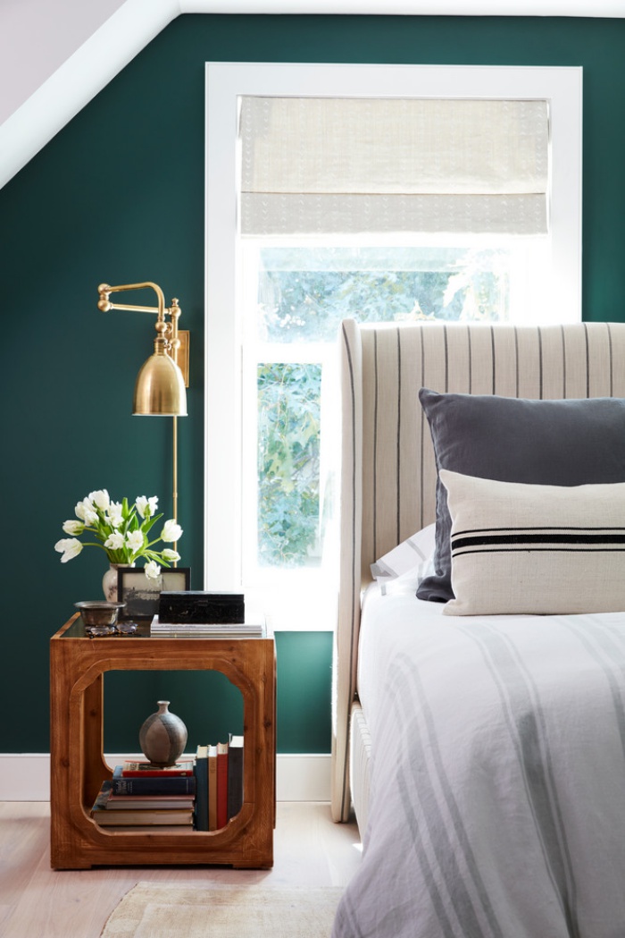 Góc nhỏ đầu giường thêm ấn tượng khi chiếc đèn kim loại mạ màu vàng đồng gắn trên tường màu xanh nổi bật.