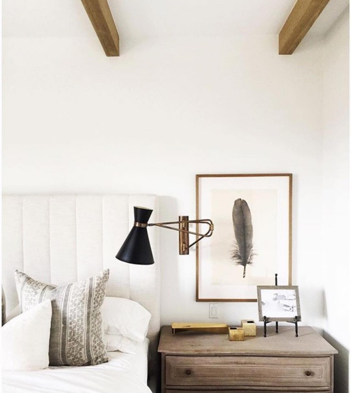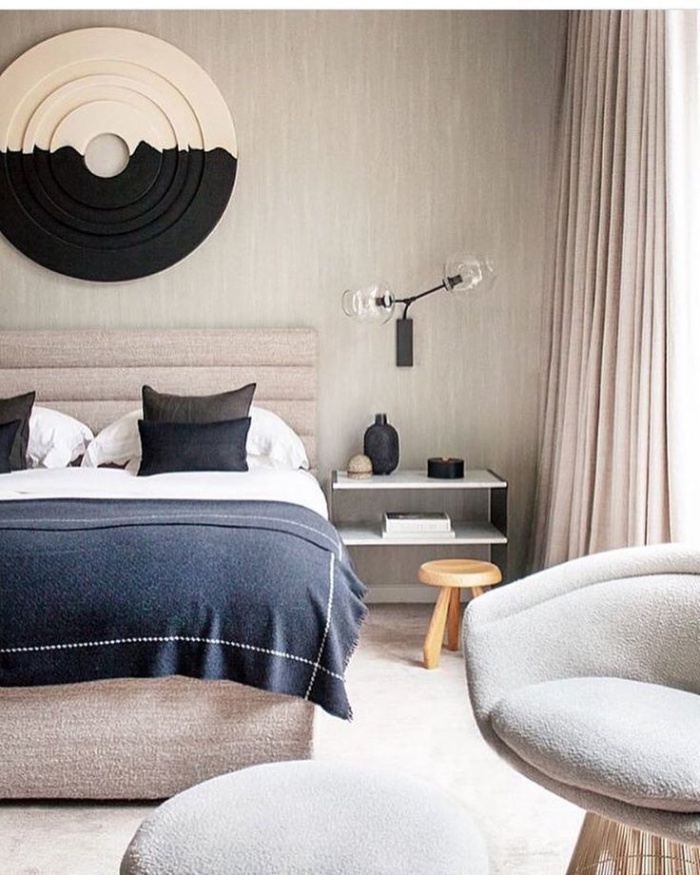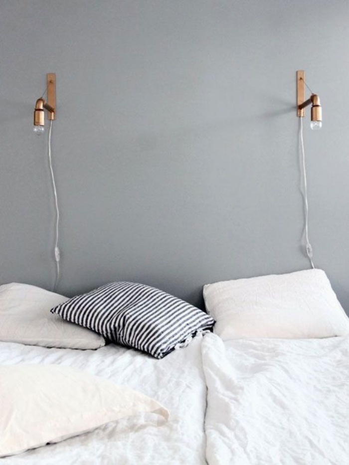 Màu be xám cũng là gam màu giúp những chiếc đèn gắn tường làm duyên điểm tô cho không gian đầu giường.