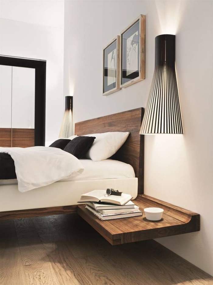 Đèn gắn tường màu đen giúp không gian nghỉ ngơi rộng rãi hơn. Trên nền tường trắng, chiếc đèn màu đen như điểm nhấn cá tính và sinh động cho căn phòng.