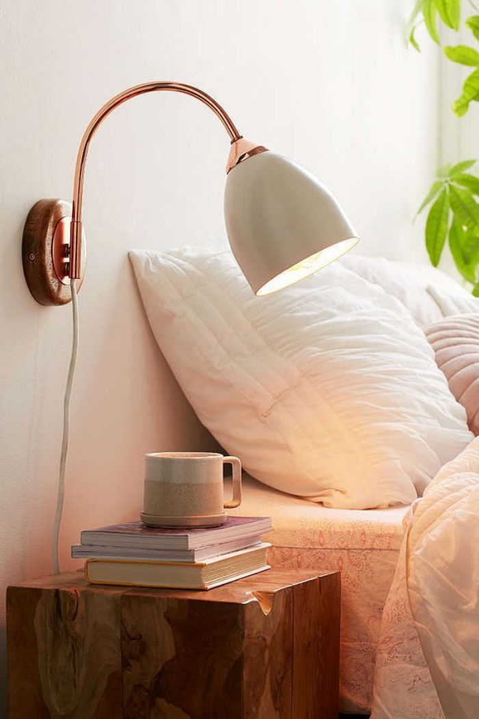 Cùng với nội thất gỗ thì nội thất, đồ trang trí bằng kim loại đang là xu hướng được nhiều người ưa chuộng hiện nay. Không gian đầu giường hẳn là cần đến sự gọn gàng và giản đơn. Vì thế, sự hiện diện của chiếc đèn kim loại mang lại cho nơi nghỉ ngơi điểm nhấn vô cùng ấn tượng, tinh tế và gọn đẹp không ngờ.