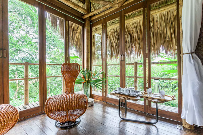 Với thiết kế chủ yếu từ chất liệu tre, ngôi nhà này đảm bảo rằng lúc nào cũng mát rượi, có sự riêng tư cần thiết, trong khi đó vẫn cung cấp một cái nhìn đẹp mắt trong tổng thể của khu rừng gần 5 ha gồm trang trại hữu cơ và tre bao quanh nó. Nơi này toát lên vẻ thoải mái và thư giãn. Bạn cũng có thể dành khoảng thời gian tốt đẹp với bạn bè vào cuối tuần ở nơi đây.